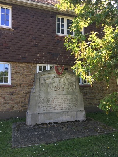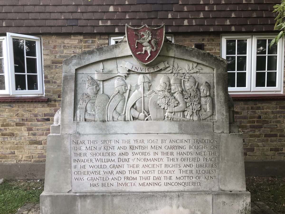 Near this spot by ancient tradition the men of Kent and Kentish men carrying boughs on their shoulders and swords in their hands met the invader William Duke of Normandy. They offered peace if he would grant their ancient rights and liberties otherwise war and that most deadly. Their request was granted and from that day the motto of Kent has been INVICTA meaning Unconquered.